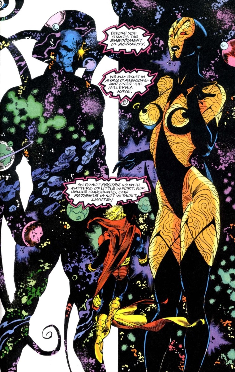 Below these aspects of the divine and the archangels both in rank and power are the Endless which resemble the abstract entities in the Marvel universe. The DC universe is essentially Abrahamic and not dharmic. I would suggest that the abstract entities of the Marvel Universe are more powerful than the Endless since they combine the functions and powers of the aspects of the divine and archangels into one being i.e. power is less dispersed in the Marvel universe than in the DC universe. In both cases there does seem to be some sort of trade off. If a sufficiently powerful concrete being decides to become an abstract entity then they must take on some sort of natural role in the universe. The Endless (Vertigo) are clearly not only cosmic entities but abstract entities.