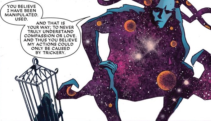 The following scene from Deadpool vs Thanos #4 shows the difficulty in making such exalted characters rounded characters.