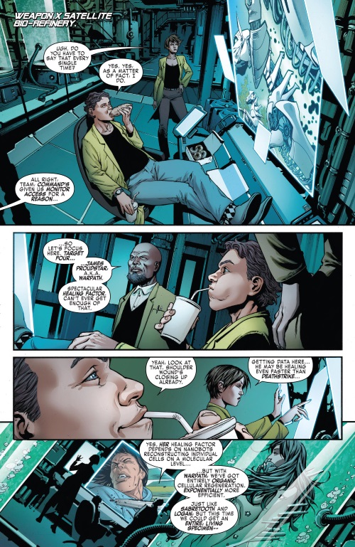 A mysterious organization is studying accelerated healing with unwilling human subjects in Weapon X V3 #2 and they conclude that Warpath (Marvel) has a superior healing rate compared to Lady Deathstrike (Marvel).