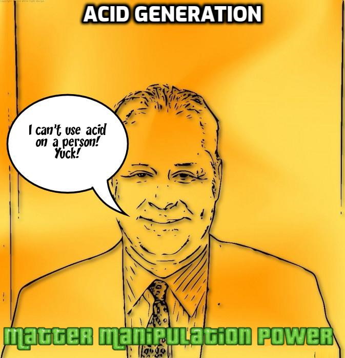 Acid generation is a disgusting superpower and is often used to generate horror in the readers. Acid generation is a power that makes sense for a supervillain since they will have less compunction about using such a horrible power or used ironically by a superhero such as Zeitgeist (Marvel). The irony is exaggerated because Zeitgeist vomits acid which is just about the most disgusting delivery system that isn’t x rated (X-Force #116)! Zeitgeist belongs to X-Statix which is a satire predictably.