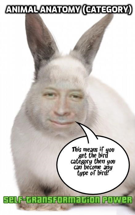 Animal Anatomy (category) – The person can turn into any animal in a category of animals and gains the powers of that animal. Animal Anatomy in general is also known as Animal Form, Animal Mimicry, Animal Morphing, Animal Physiology, Animal Shapeshifting, Animality (Mortal Kombat), Animorphing, Beast Within (Bayonetta), Faunal Form, Fauna Morphing, Skinwalker Effect and Therianthropy.