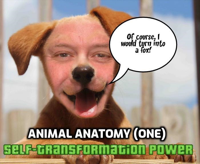 Animal Anatomy (one) – The character can only turn into one type of animal. Animal Anatomy in general is also known as Animal Form, Animal Mimicry, Animal Morphing, Animal Physiology, Animal Shapeshifting, Animality (Mortal Kombat), Animorphing, Beast Within (Bayonetta), Faunal Form, Fauna Morphing, Skinwalker Effect and Therianthropy.