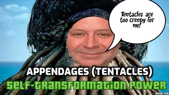 Appendages (tentacles) – The character has tentacles. Appendages (tentacles) is also known as Combat Tentacles, Prehensile Tentacles, Tentacle Extension, Tentacle Generation and Tentacle Retraction.