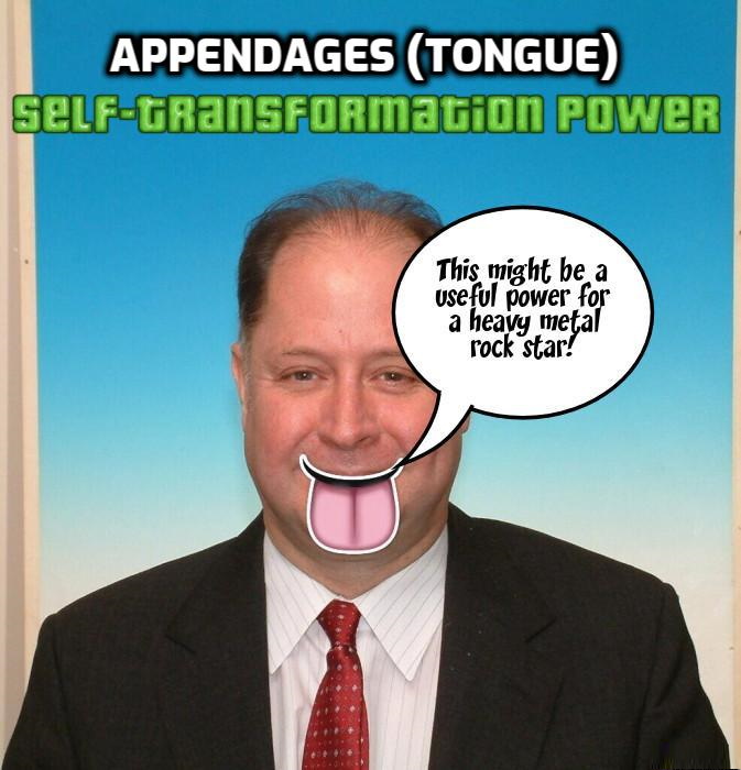 Appendages (tongue) – The character has a prehensile tongue. Appendages (tongue) is also known as a Prehensile Tongue, Elastic Tongue, Frog Tongue, Toad Tongue and Tongue Extension.