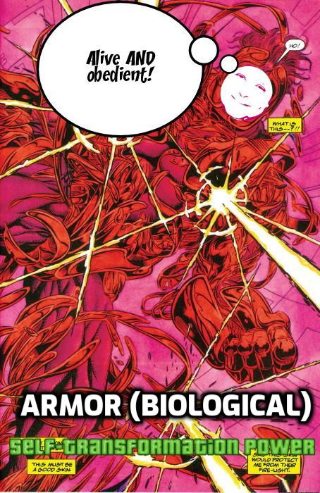 An armor that is biological is more exotic than one that is made out of mere matter. There is also a suggestion that such an armor reflects a higher level of technology. Spawn (Image) has armor that mutated in First Metamorphosis (Spawn V1 #41).