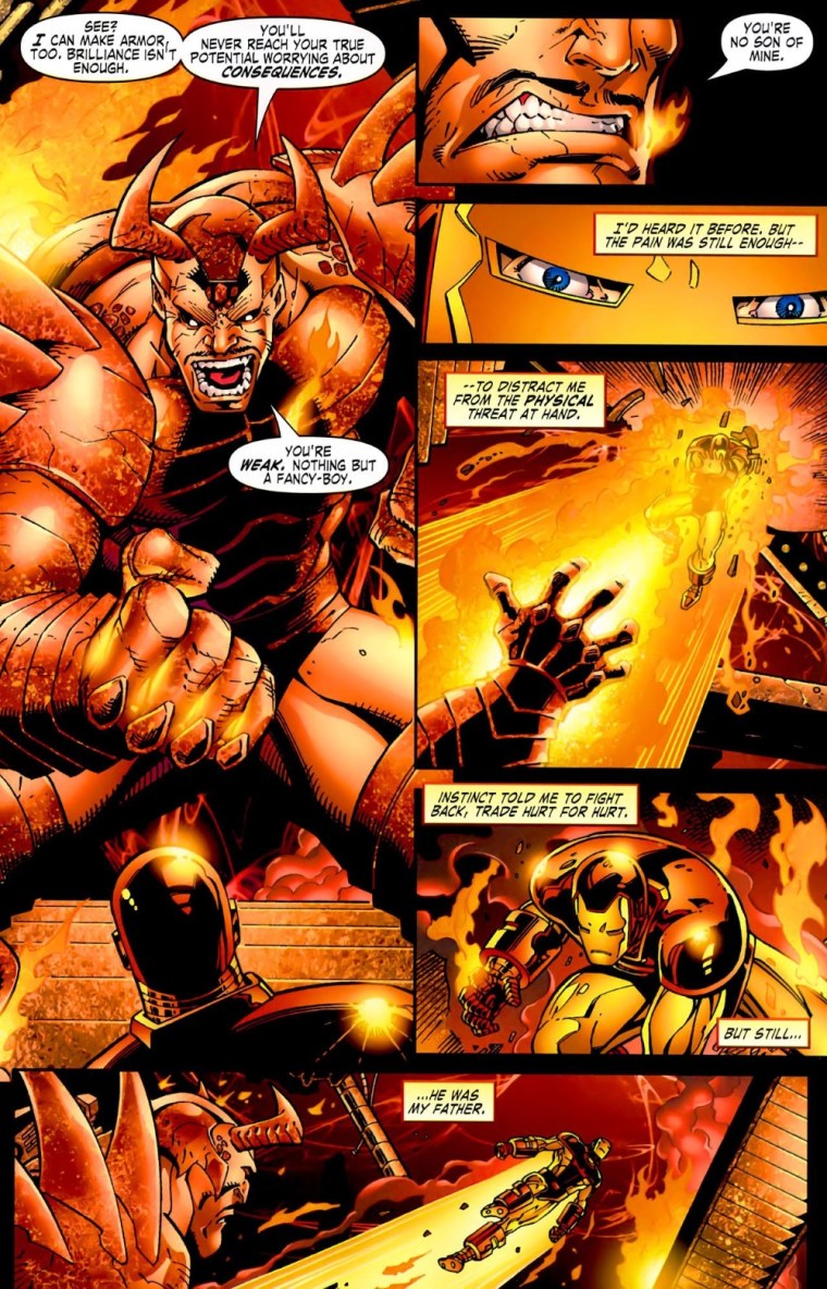 Howard Stark (Marvel) seemingly uses magic armor to fight his son Tony Stark in Iron Man – Legacy of Doom #2.