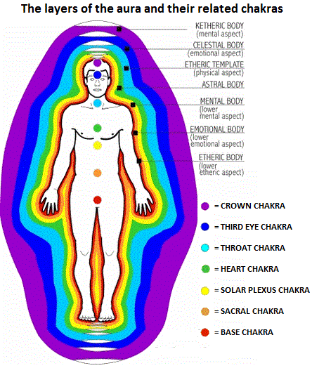 I first ran into the idea of aura’s when I was thirteen and reading the works of Lobsang Rampa. I never ever was able to “see” and aura despite countless hours following the directions in his books but I do think different people seem to exude different colors that one can sense rather than see. The illustration below is from one of his books.