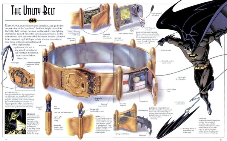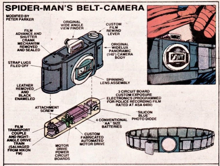Spider-Man (Marvel) has a utility belt that enables him to take pictures for his day job as a newspaper reporter.