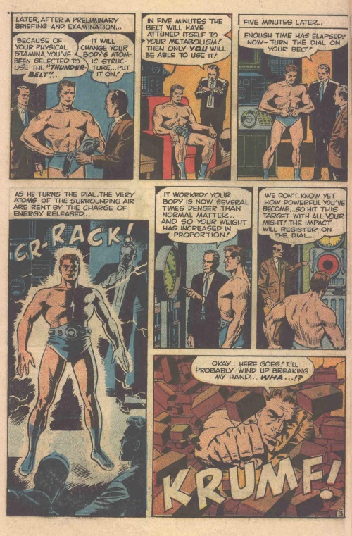 Dynamo receives the “thunder belt” which allows him to increase the density of his body in T.H.U.N.D.E.R. Agents #1 (Tower).