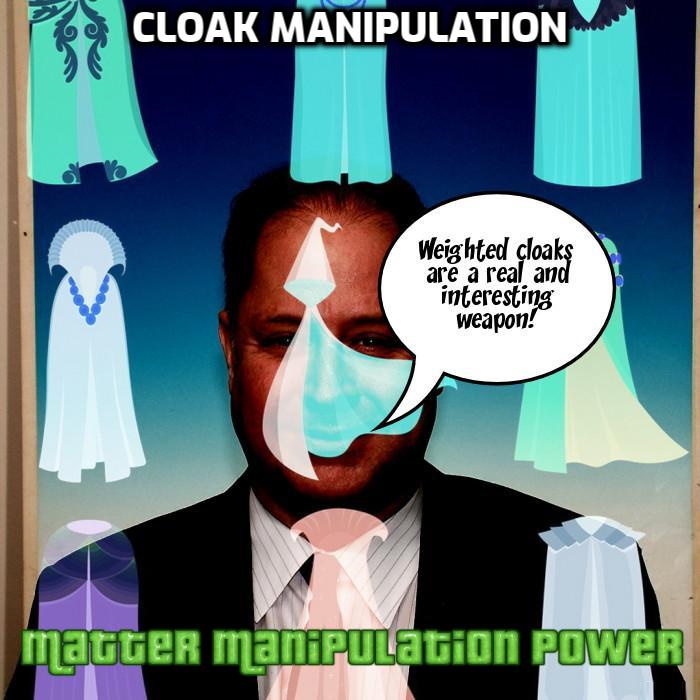 Cloak Manipulation – The ability to manipulate a cloak to achieve superhuman effects due to skill and/or properties of the cape. Cloak Manipulation is also known as Animated Cape, Cape Manipulation, and Prehensile Cape. A subcategory of (350) Power Bestowal (objects).