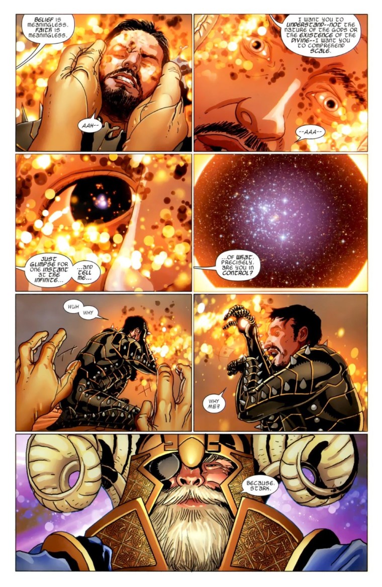 Odin (Marvel) shares some of his cosmic awareness with Tony Stark in Iron Man #7.3 (2012).