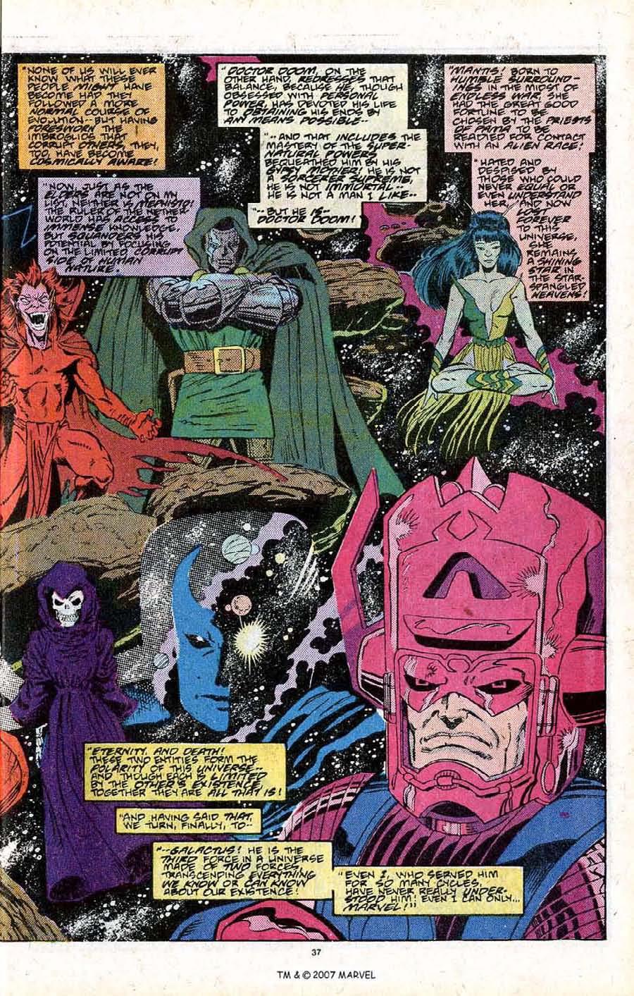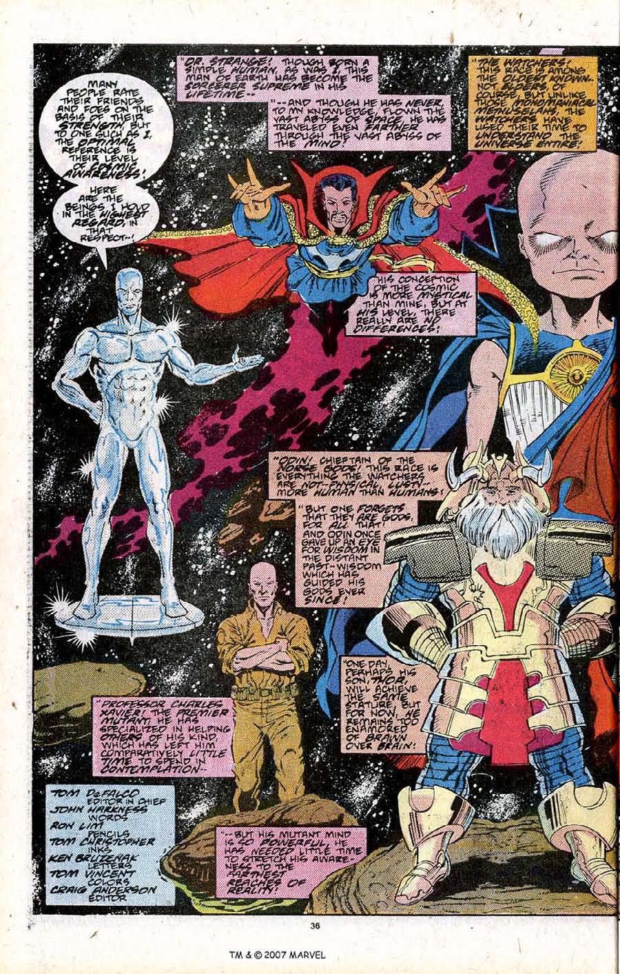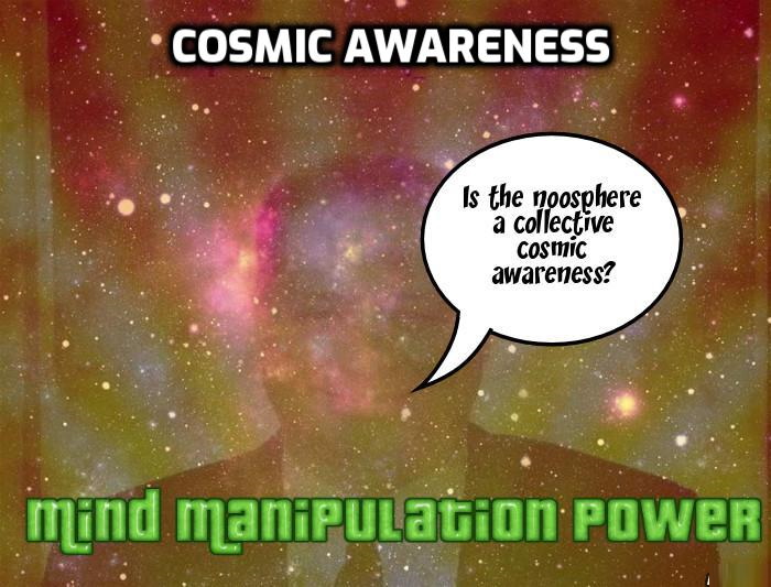 In Silver Surfer Annual #2, the Silver Surfer (Marvel) compares Marvel characters in terms of their level of cosmic awareness. The Silver Surfer thinks the following beings have high levels of cosmic awareness: Death, Doctor Doom, Dr. Strange, Eternity, Galactus, Mantis, Odin, Professor Charles Xavier and the Watchers. Mephisto could use his powers to have a high level of cosmic awareness but squanders this potential by focusing on human corruption.