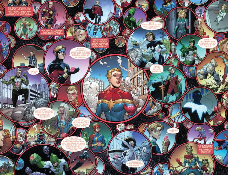 Captain Marvel can see across dimensions thanks to the Reality Stone, one of the Infinity Gems, in Infinity Countdown: Captain Marvel #1 (2018).