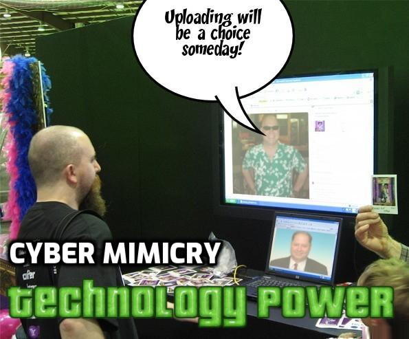 Cyber Mimicry – The ability to become a computer-generated being. The main advantage of uploading your consciousness to the internet and saying good bye to your body is possible immortality. Cyber Mimicry is also known as Artificial Intelligence Mimicry, Artificial Intelligence Physiology, Cyber Body, Cybernaut Mimicry, Cybernaut Physiology, Data Form, Data Mimicry, Data Physiology, Digital Body, Digital Form, Digital Mimicry, Digital Physiology, Digitization, Digitized and Information Physiology.