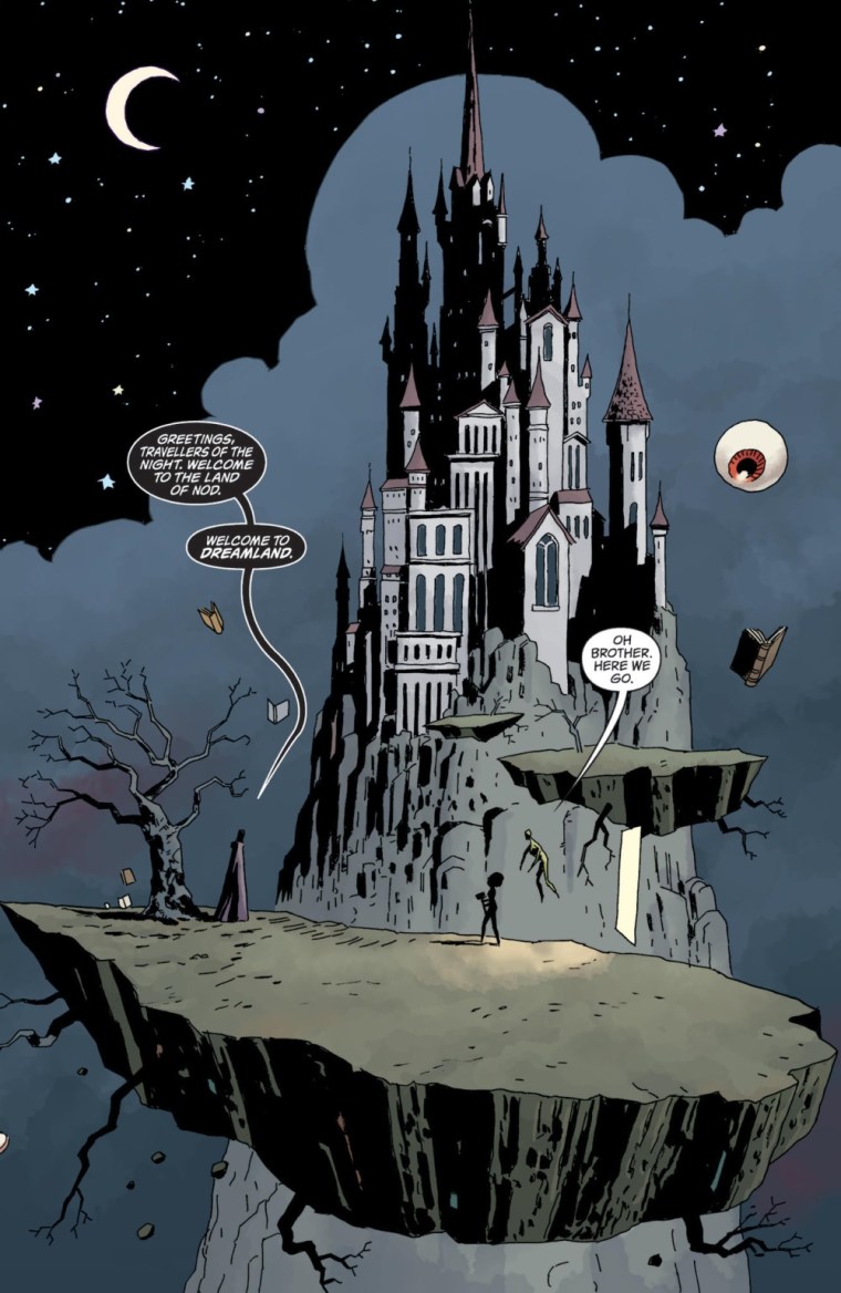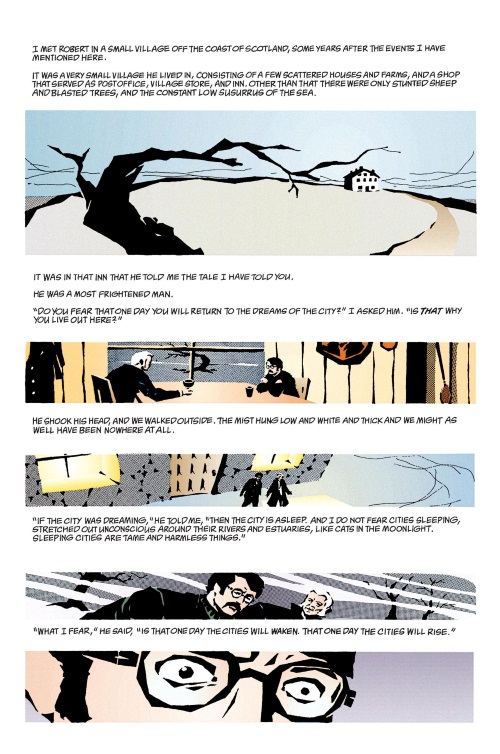 A man crosses a road and ends up in a dream by a city in “A Tale of Two Cities” – The Sandman-World’s End V8 (2012).