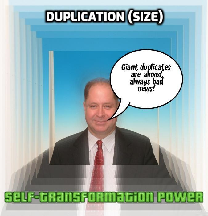 Duplication (size) – The ability to create a duplicate that is bigger or smaller. Duplication (size) is also known as Shrinking Replication, if the copies are smaller and Growing Replication, if the copies are bigger.