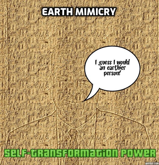 Earth Mimicry – The being has a body composed of earth. Earth Mimicry is also known as Earth Physiology, Earthen Mimicry, Geo Mimicry, Geokinetic Mimicry, Terra Mimicry and Terrakinetic Mimicry. Similar to (385) Sand Mimicry and (413) Stone Mimicry.