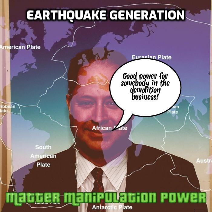 Fault Zone (Marvel) can generate earth quakes (Marvel Nemesis – Rise of The Imperfects Official Game Guide).