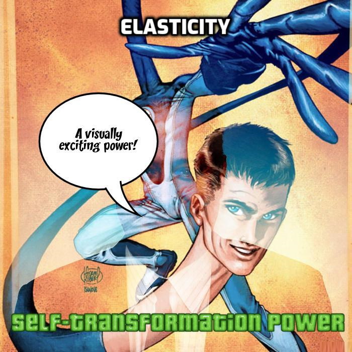 Elasticity – The ability to stretch, deform, expand or contract one’s body into any form imaginable. Elasticity is also known as Ductility, Elastic, Elongation, Expandable, Malleable, Mutability, Plasticity, Pliability, Stretch Powers, Stretchability, Stretchable Body, Stretchy and Super Stretching.