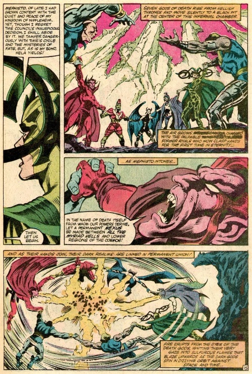 As an embodiment of a function the characters powers operate in a manner similar to natural law i.e. minus volition. If Hela (Marvel) dies then beings stop dying as shown in Thor V1 #190. Death is treated in a similar manner in the Vertigo (DC) universe. I deal with the subject of the death of death in detail in (223) Immortality (others). However, Hela shares her function with other death gods as shown in Annual Thor V1 #10.