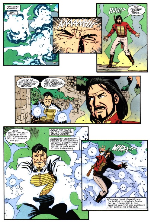 Konstantin Romanov fires energy blasts in Nikolai Dante – “Tour of Duty” – 2000 AD #1133.