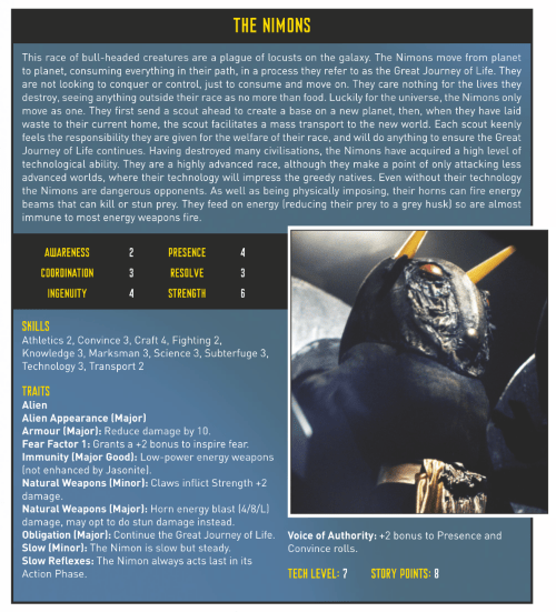 Nimons emit energy blasts from their horns in Fourth Doctor Sourcebook.