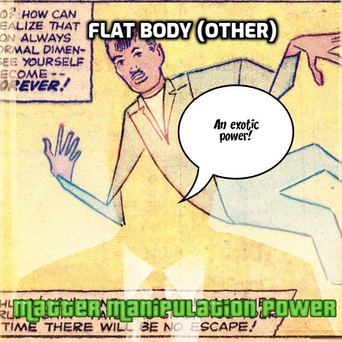 Flat Body (other) – The ability to give others a flat body i.e. more two-dimensional. Flat Body (other/self) is also known as 2D Form, 2D Mimicry, 2D Physiology, Pancake Flatness, Self-Compression and Two-Dimensional Form.
