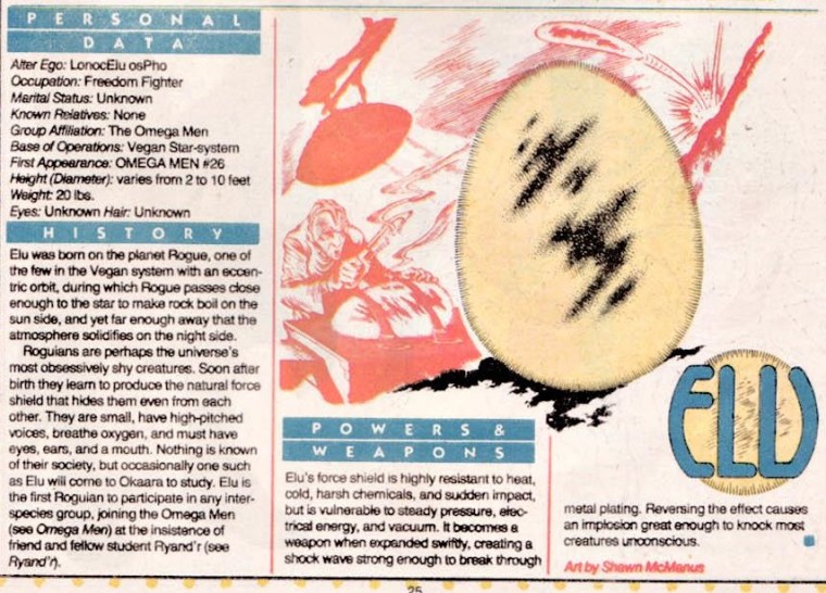 Elu (DC) uses his force field to hide as well as protection in DC Who’s Who V1 #7.