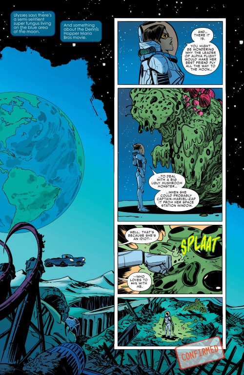 Spider Woman (Marvel) humorously deals with a mushroom monster on the Moon in Spider-Woman V5 #10.