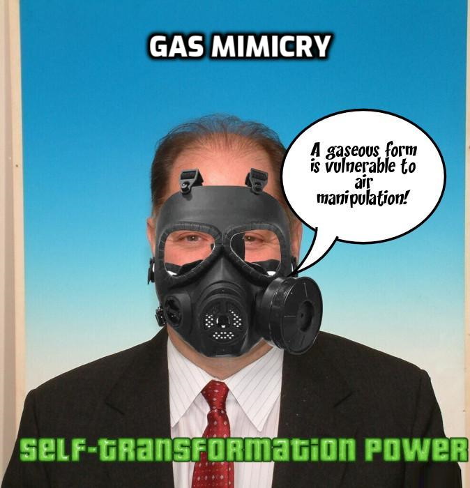 Gas Mimicry – The being has a body composed of gas. Gas Mimicry is also known as Bezinikinetic Physiology, Gas Form, Gas Physiology, Gaseous Form, Gaseous Mimicry and Gaseous Physiology.