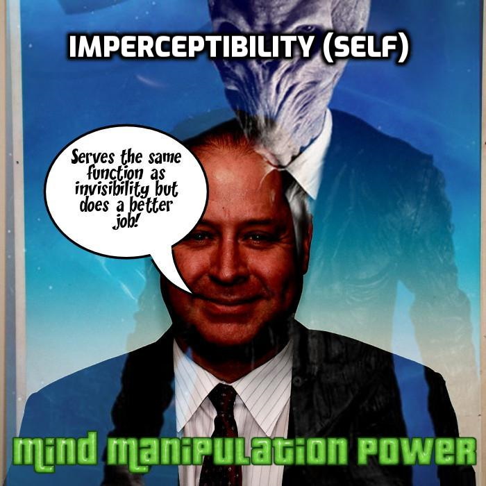 Imperceptibility (self) – A person with this power cannot be perceived or if perceived then immediately forgotten. Imperceptibility (other/self) is also known as Aura Negation, Empty Presence, Non-Aura, Non-Presence, Presence Negation, Relative Nonexistence, Undetectability and Undetected Presence.