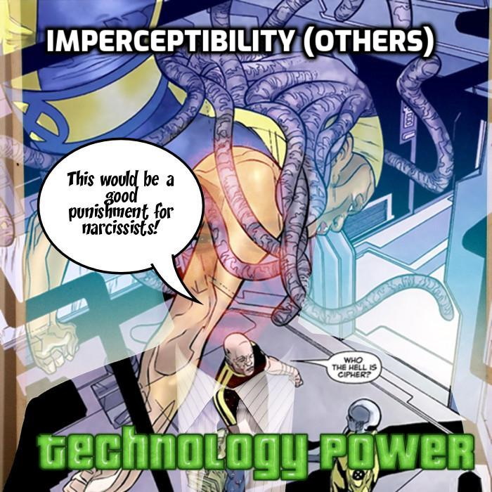 Imperceptibility (others) – The ability to make another imperceptible and/or imperceptibility is forced unto the person by an external agency. Imperceptibility (other/self) is also known as Aura Negation, Empty Presence, Non-Aura, Non-Presence, Presence Negation, Relative Nonexistence, Undetectability and Undetected Presence.