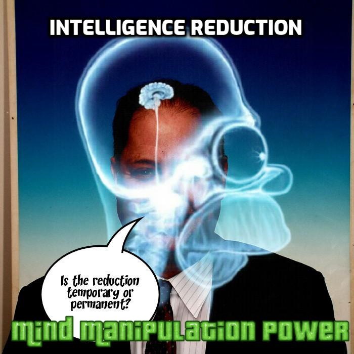 Intelligence Reduction – The ability to reduce the intelligence of others. Intelligence Reduction is also known as Intelligence Decline and Kogata no Smarts.