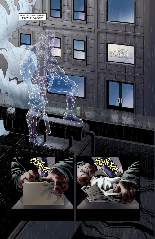 An assassin has some sort of invisibility technology in Elephantmen 2260 V5 (Image).