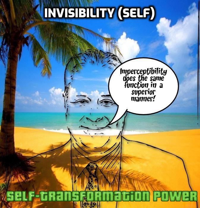 Invisibility (self) – The ability to render the user unseen to the naked eye and/or other forms of perception. Invisibility (self) is also known simply invisibility and as fading.