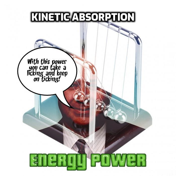 Kinetic Absorption – The ability to absorb forms of kinetic energy into oneself and utilize it in some way, such as by converting it into physical strength or using it to power energy blasts. Kinetic Absorption is also known as Kinetic Empowerment and Shock Absorption.