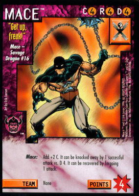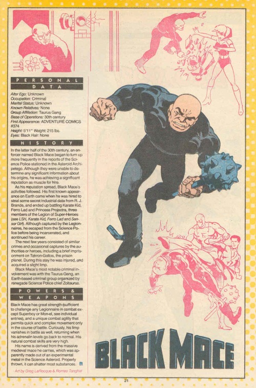Black Mace (DC) uses a mace made out of an experimental material that allows the mace to shatter most substances and can deliver an electrical shock (DC Who’s Who Update ’87 #1).