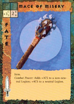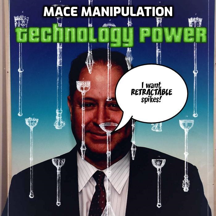 Mace Manipulation – The mace can be used for various superhuman effects due to the skill of the user and/or special properties of the mace. Mace Manipulation is also known as Enhanced Macemanship and Enhanced Mace Proficiency. A subcategory of (490) Weapon Manipulation. Other weapons include (049) Arrow Manipulation, (060) Axe Manipulation, (079) Bow Manipulation, (176) Everyday Object Weaponization, (205) Hammer Manipulation, (407) Spear Manipulation, (411) Staff Manipulation, 448) Thrown Weapon and (494) Whip Manipulation. (490) Weapon Manipulation is a subcategory of (350) Power Bestowal (objects).