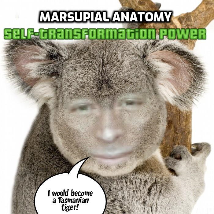 Marsupial Anatomy – The character has the form and/or characteristics of a marsupial. Marsupial Anatomy is also known as Marsupial Body, Marsupial Form, Marsupial Manifestation, Marsupial Mimicry and Marsupial Physiology.