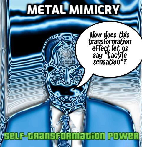 Metal Mimicry –The character has a body composed of metal. Metal Mimicry is also known as Ferro Body, Ferro Form, Ferro Mimicry, Ferro Physiology, Ferrokinetic Mimicry, Ferrokinetic Physiology, Metal Body, Metal Form, Metal Physiology, Metallic Body, Metallic Form, Metallic Mimicry, Metallic Physiology, Metallicization and Metallization. (288.1) Metal Mimicry (molten) is a specialized form of this power.