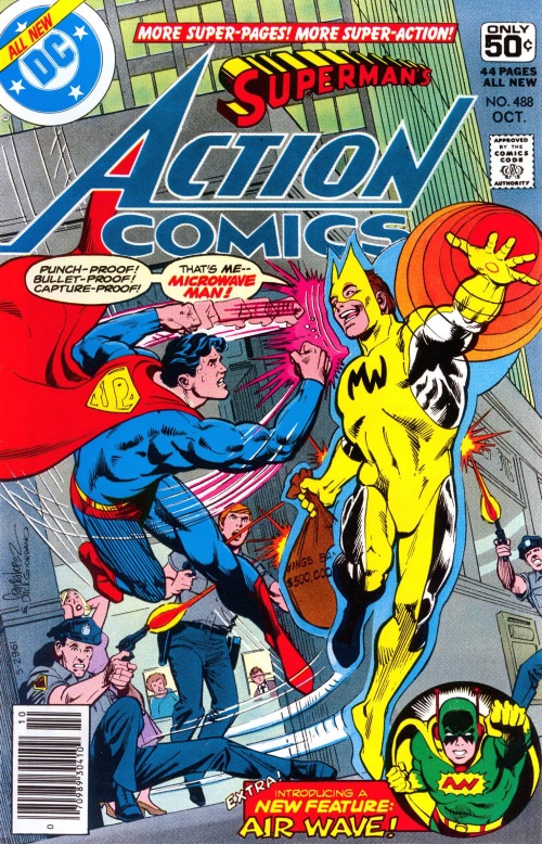 Microwave Man (DC) uses microwaves for a variety of effects, such as force fields, that show that the writers don’t understand what microwaves are in Action Comics V1 #488.