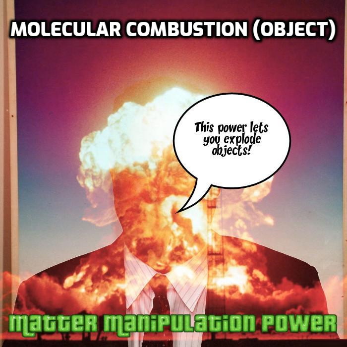 Molecular Combustion (object) – The ability to make an object explode. Molecular Combustion (object) is also known as Blasting, Blowing Up, Exploding and Explosion Power.