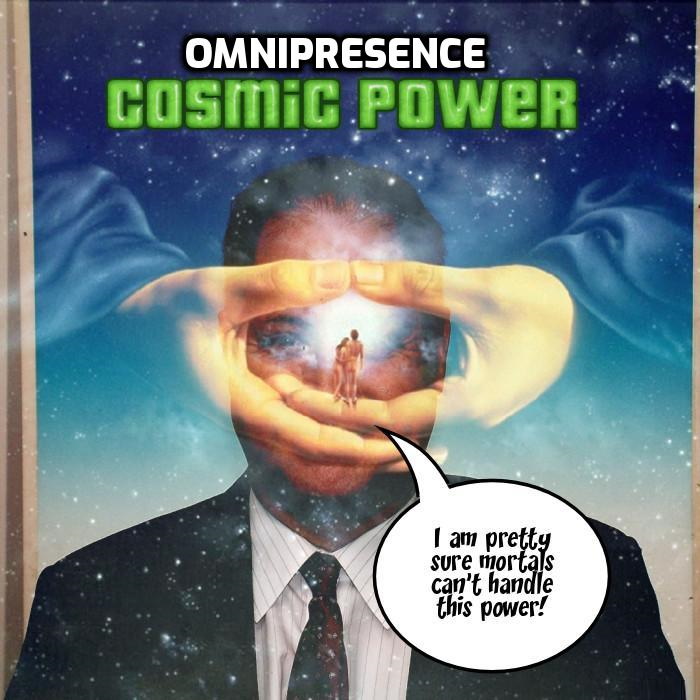 Omnipresence – The ability to be everywhere at the same time. Omnipresence is also known as All-Presence, Absolute Presence, Boundless Presence, Infinite Presence, Pervasive, Rifeness, True Omnipresence, Ubiquitary, Ubiquitous and Ubiquity.