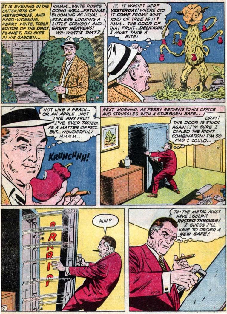 Perry White (DC) gets superpowers by eating a fruit from Xasnu aliens in Action Comics V1 #278 (1961).