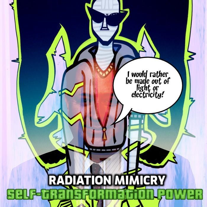 Radiation Mimicry – The ability to become radiation. A subcategory of (172) Energy Mimicry. Radiation Mimicry is also known as Radiation Physiology, Radiokinetic Mimicry and Radiokinetic Physiology. Similar to (320) Nuclear Reactor. Characters listed in the nuclear reactor article are not listed here.