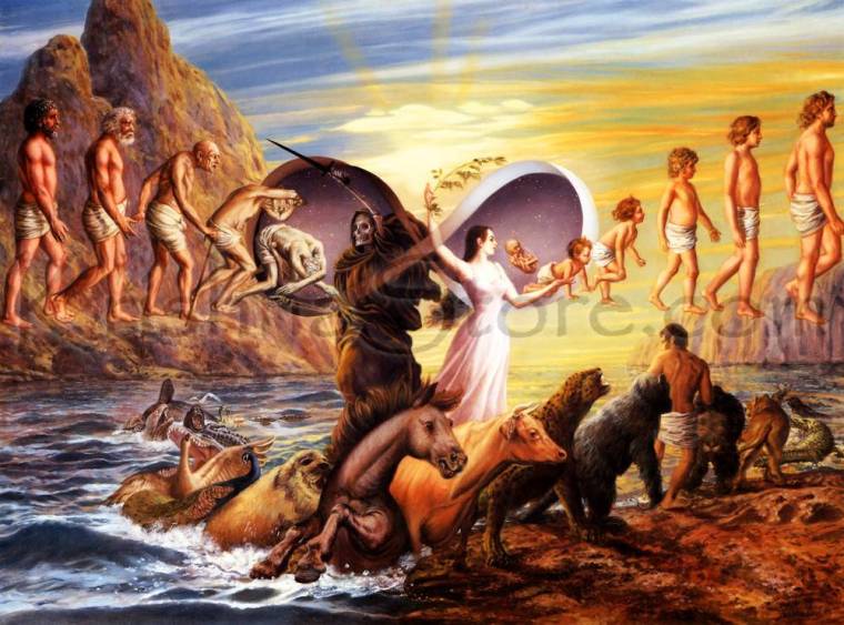 A print of the following painting describing the cycle of birth and death (Saṃsāra) can be bought at the Krishna Store.