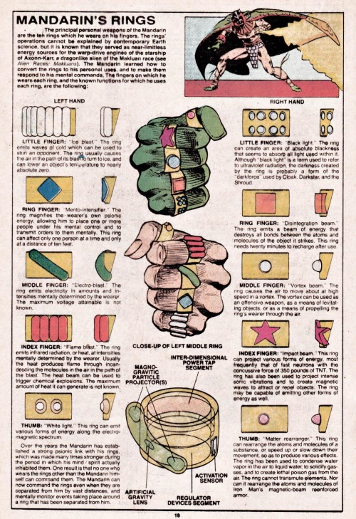 The Mandarin (Marvel) has ten rings and each ring has a different superpower (Official Handbook of the Marvel Universe V1 #15).