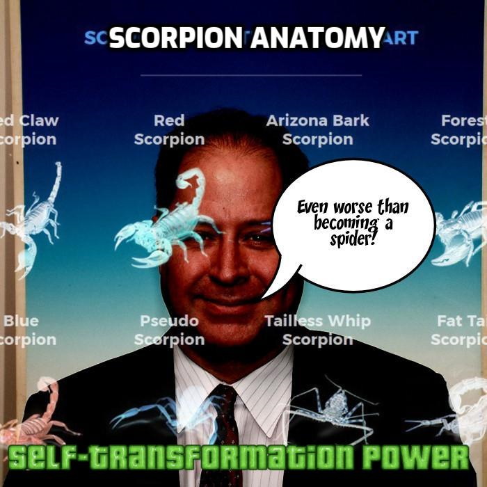 Scorpion Anatomy – The character has the form and/or characteristics of a scorpion. Scorpion Anatomy is also known as Scorpion Body, Scorpion Form, Scorpion Mimicry and Scorpion Physiology. Similar to (232) Insect Anatomy. A subcategory of (043) Arachnid Anatomy.