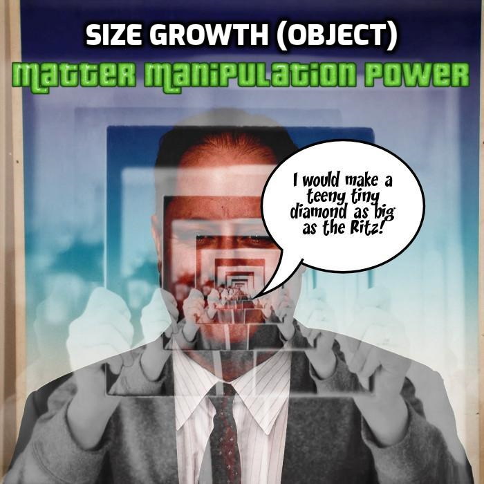 Size Growth (object) – The ability to make an object and/or another living being grow larger. This power is especially useful if you also have (395) Size Reduction (object). If I have both powers then I can shrink a tank, put the tank in my pocket and then make the object full size when I need a tank. Similar to (394) Size Growth (self).