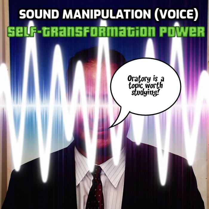 Sound Manipulation (voice) – The ability of a being to use their voice for various effects other than mind control. Sound Manipulation (voice) is also known as Voice Manipulation. Mind control using one’s voice is listed under (305) Mind Control (voice). Similar powers are (402) Sound Manipulation, (404) Sound Manipulation (scream), and (403) Sound Manipulation (music).
